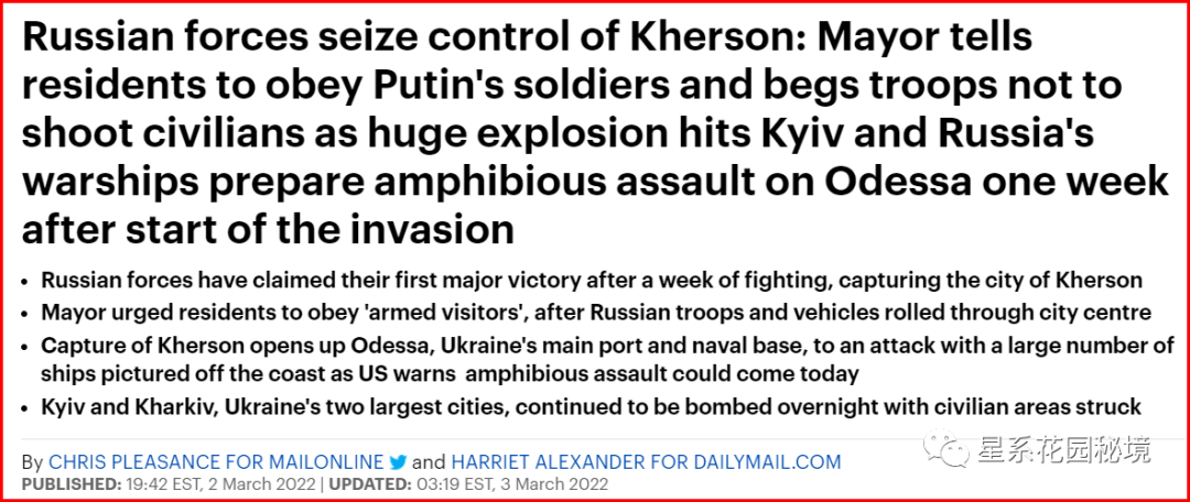 这篇关于首次大胜!俄军完全控制省会赫尔松…市长乞求怜悯,并命令市民们“遵从武装游客(俄军)的命令”…的文章就介绍到这了,希望我们推荐的答案对大家有所帮助,也希望大家多多支持!