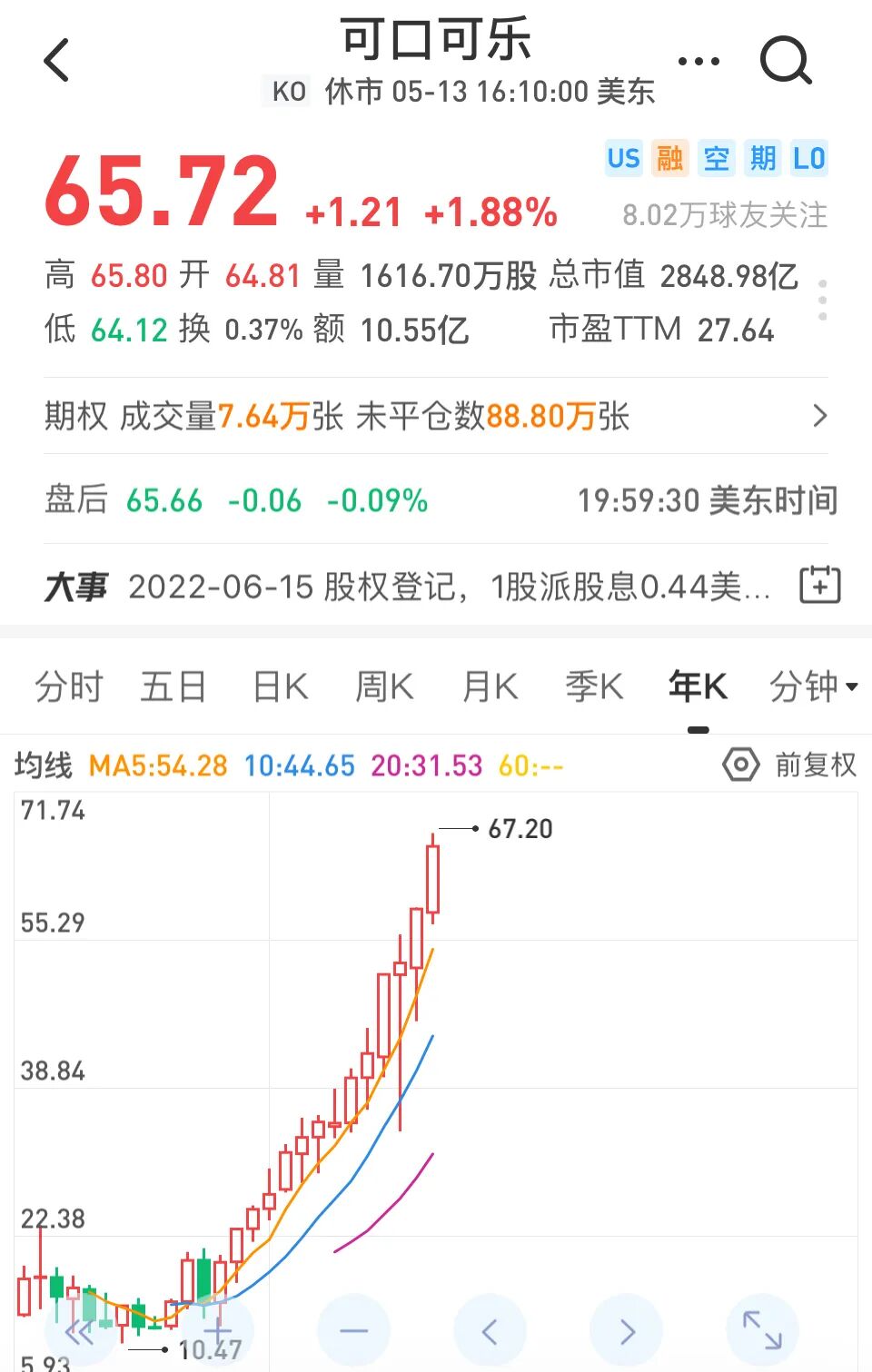 厉害了!可口可乐的股价又创出历史新高。这是一家百年老店,如果在1919年可口可乐上市之际,以40美元的价格买入一股,那么现在价值2000万美元。可口可乐的复权价在过去一百年中上涨了惊人的50万倍,看一下这优美的年线: