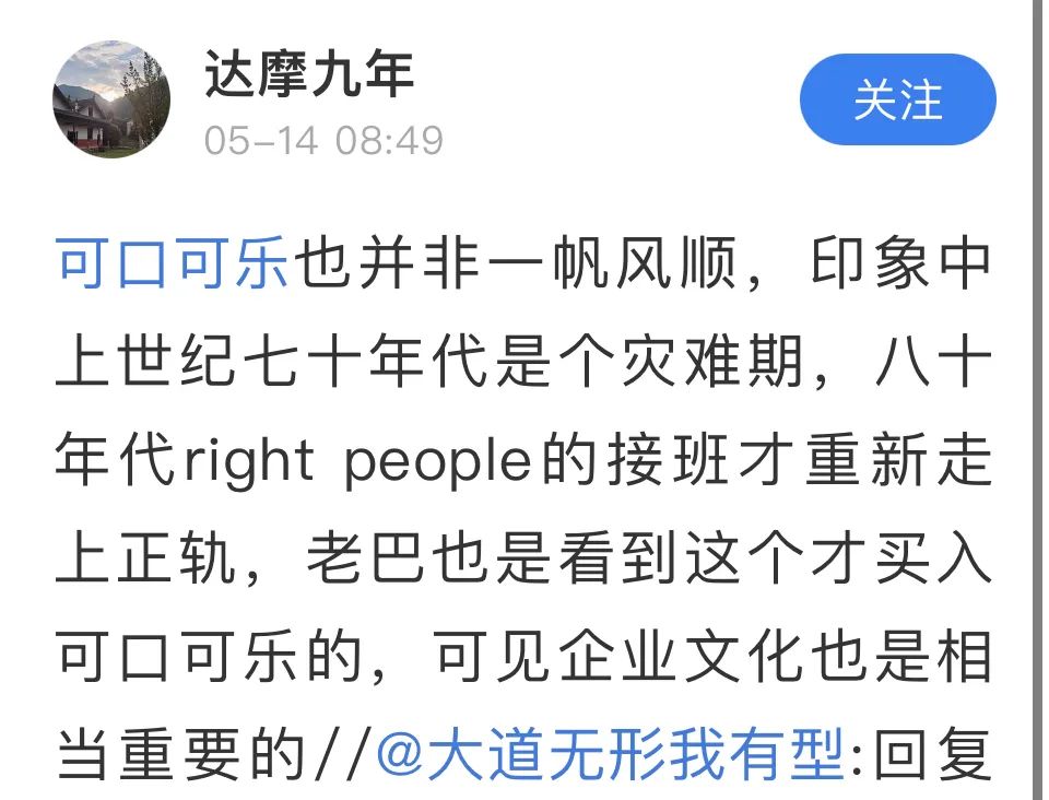 “一个汉堡”都能经营的企业?巴菲特曾经戏言,可口可乐是“一个汉堡”都能经营的企业。真的如此吗?雪球App上不少投资者并不认同。球友@达摩九年科普道:可口可乐也并非一帆风顺,印象中上世纪七八十年代,有个不错的接班人上任后才重新走上正轨,老巴也是看到这个才买入可口可乐,可见企业文化也是相当重要的。