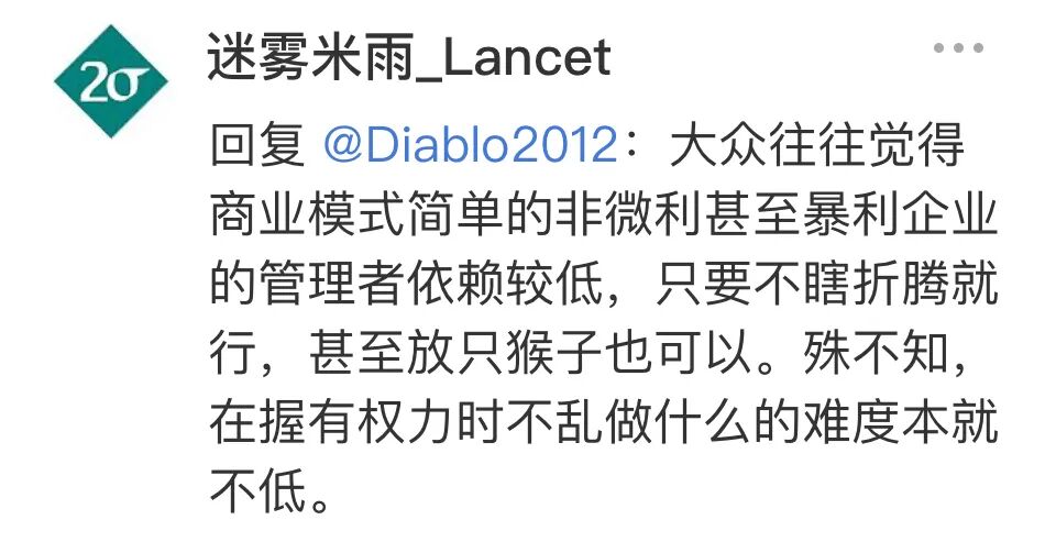 球友感概:大众往往觉得商业模式简单的非微利甚至暴利企业的管理者依赖较低,殊不知,在握有权力时不乱做什么的难度本就不低。