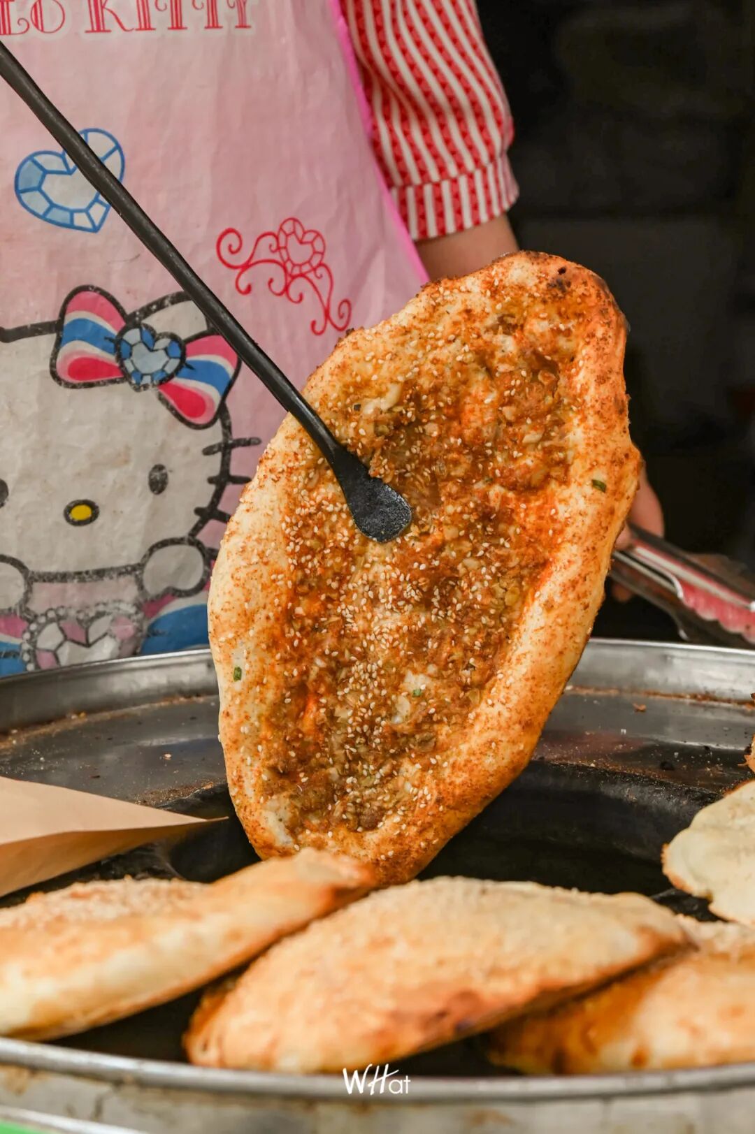 传统的长条饼胚,满满当当抹上特色榨菜鲜肉泥,孜然、辣椒粉、白砂糖、葱花芝麻层层铺撒,口重的能香个跟头,口淡的记得叫老板多加白糖。