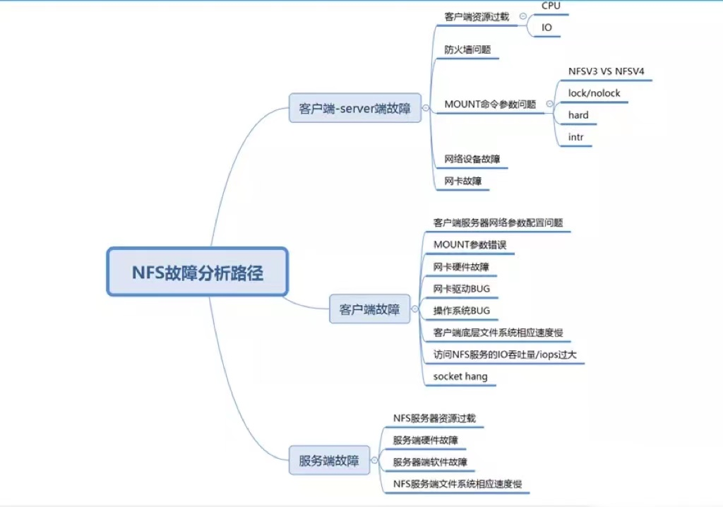 实际上使用NFS文件系统,出现客户端hang死,或者df命令HANG死的情况并不少见,我这些年里也遇到过多次。我遇到的NFS hang死问题的原因也十分复杂,不过大多数都与NFS BUG、网络问题、系统资源消耗过高、IO负载过大等有关。NFS客户端访问NFS文件hang住,一般来说有三种可能性,一种是客户端出现问题,第二种是服务端出现问题,第三种是客户端和服务端都存在问题。似乎这个总结有点太笼统了,也有点投机取巧,不过穷举法是我们在针对未知问题分析的最重要的方法。如果我们不能穷举所有的可能性,那么在问题诊断分析的时候就可能无法定位。在我多年的经验里,很多当时认为十分灵异的问题,都是因为我们以前的知识面不足,无法穷举到真正的故障路径。