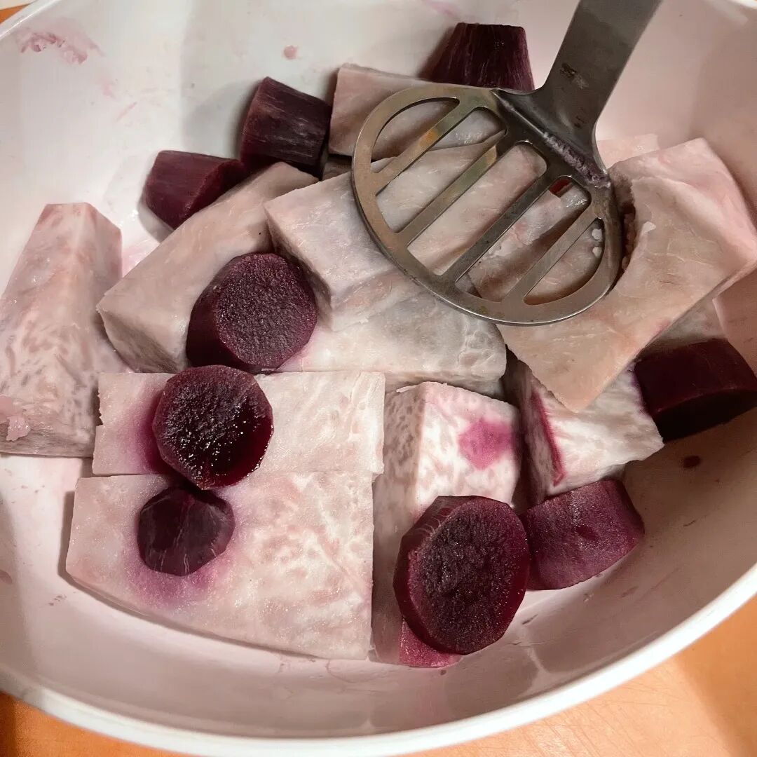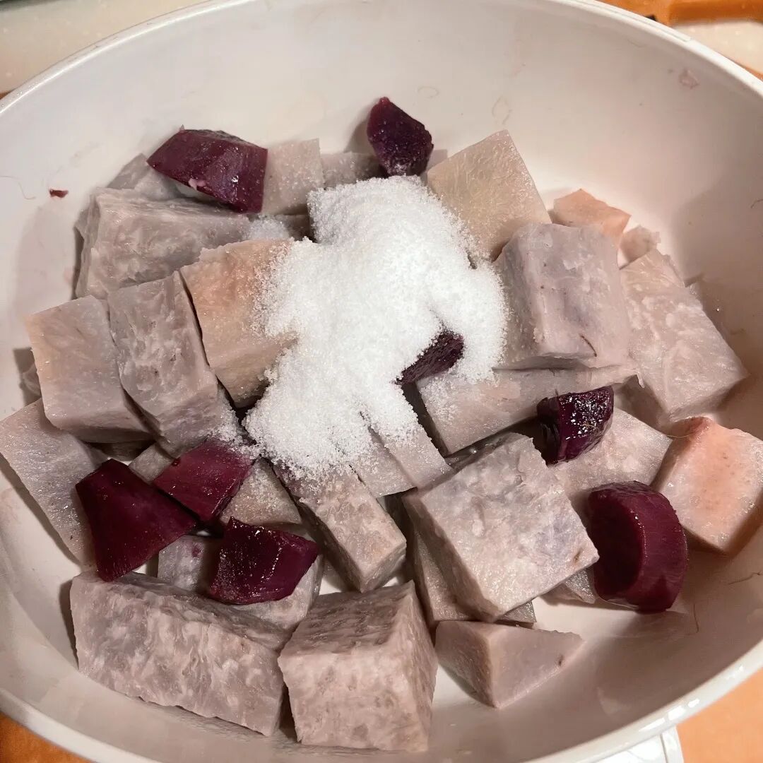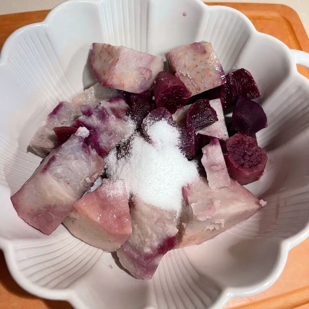 芋泥部分:荔浦芋头250g、紫薯几块增色、代糖15g