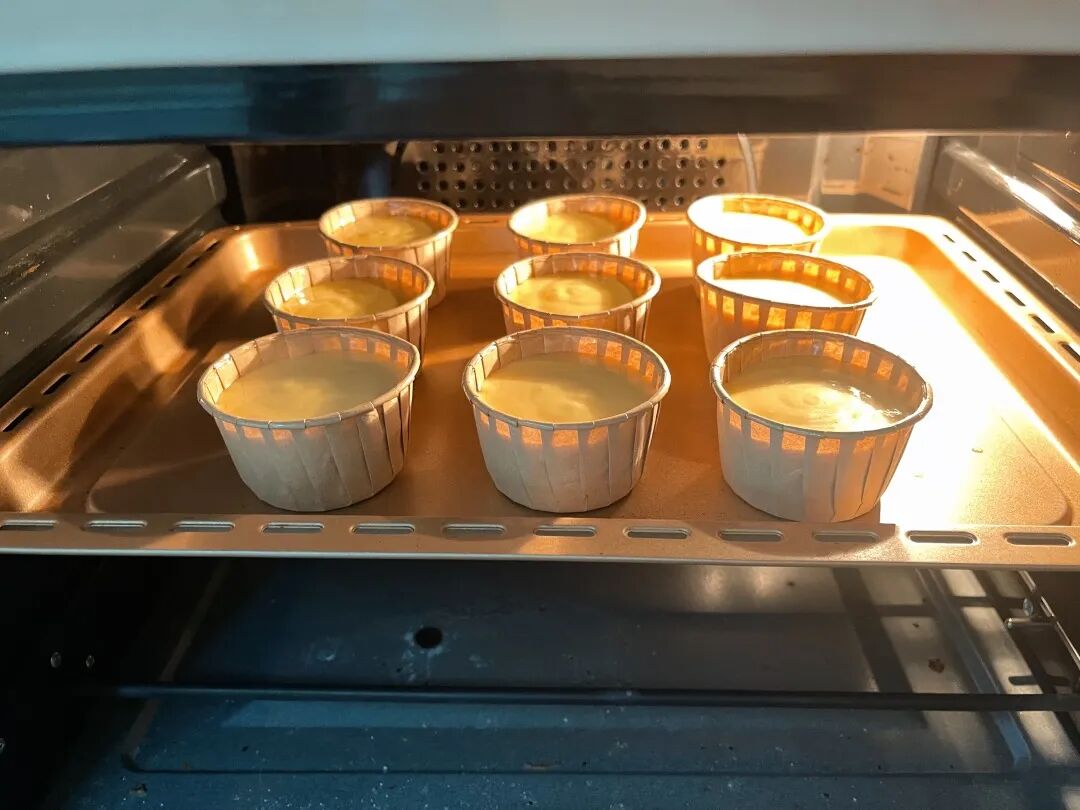 4、蛋液倒入蛋挞,7、8分满就可以不要太满。
