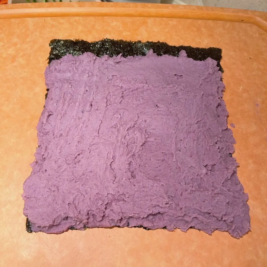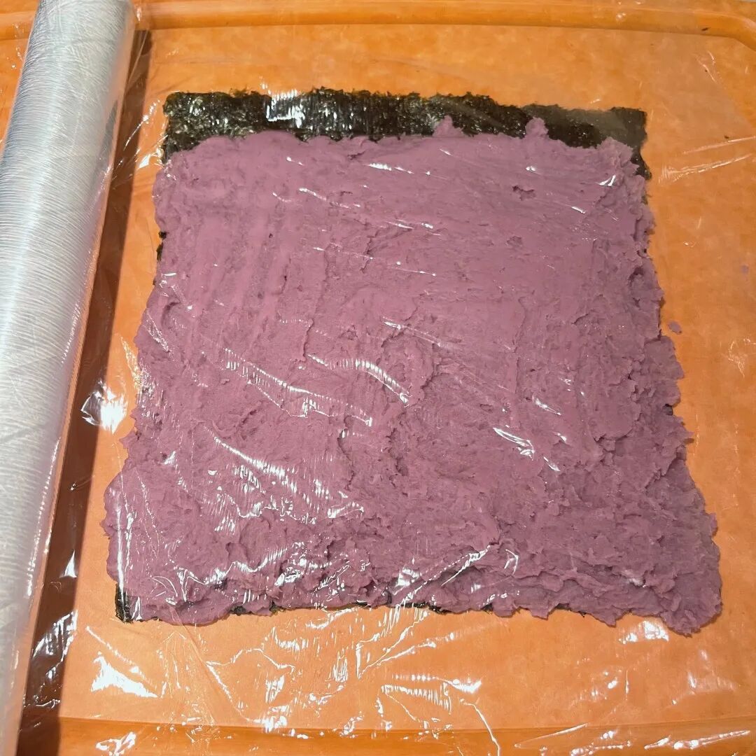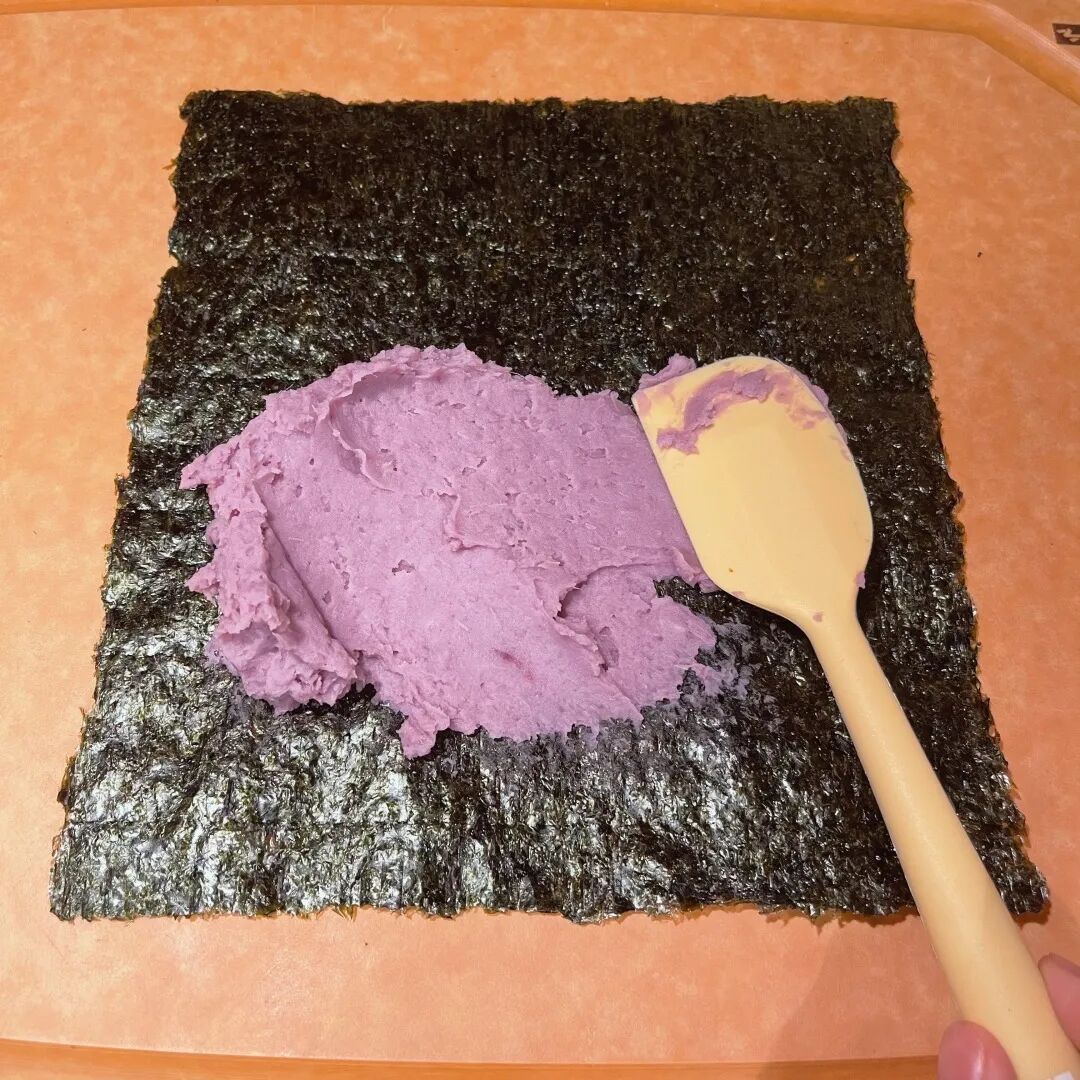 (不太会卷的话也可以正着卷,就是把芋泥当成米饭,海苔还在外面那样,会更简单一点~)