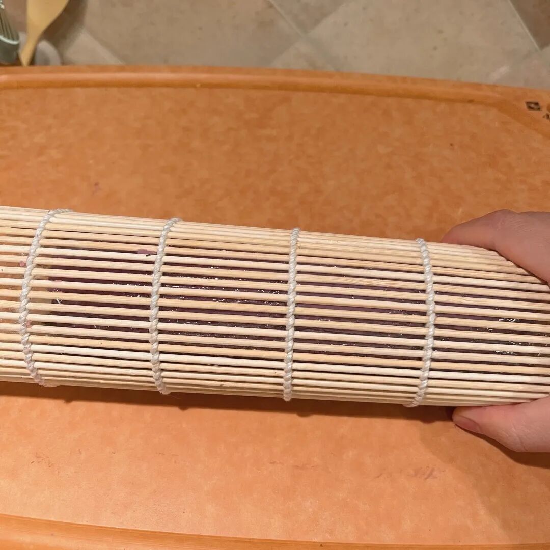 4、沿着保鲜膜卷起来,保鲜膜两头紧紧包住,然后用寿司竹竹帘整形一下。