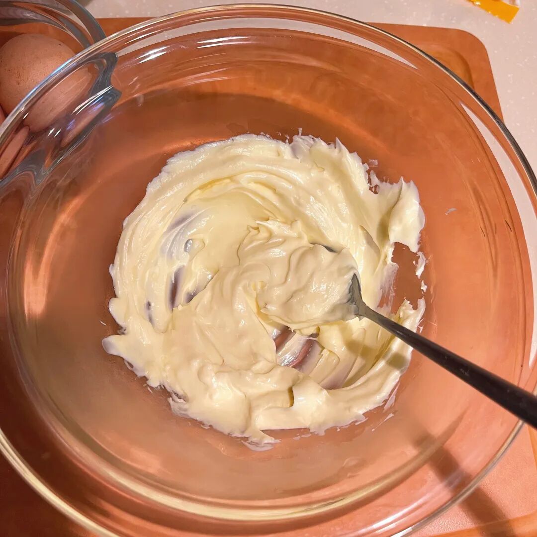 2、奶油奶酪隔热水/微波炉加热几十秒软化到可以轻松戳动,加入代糖搅拌到均匀顺滑。