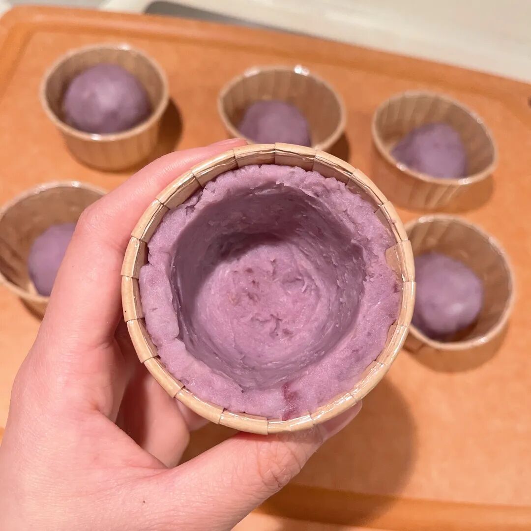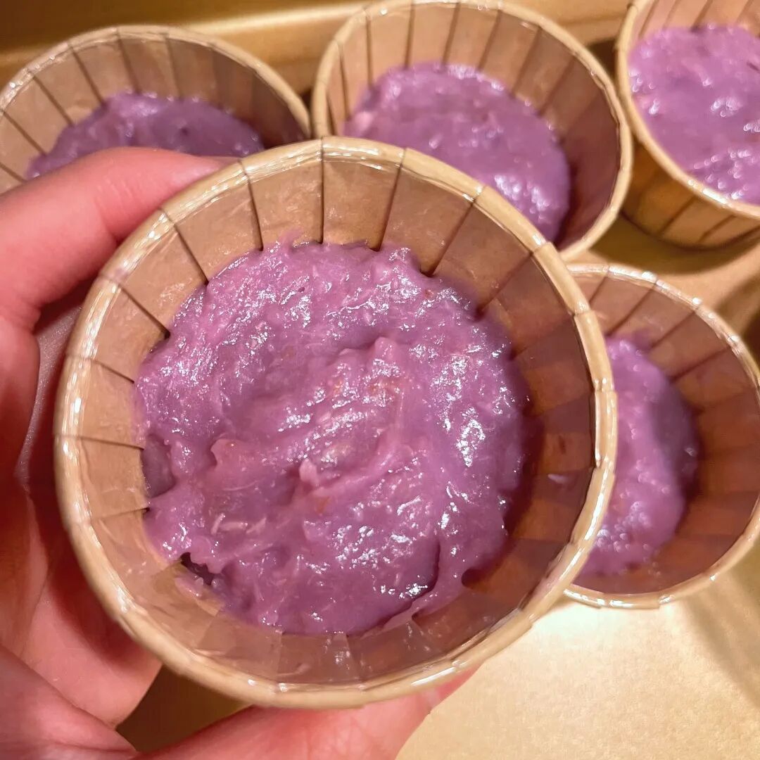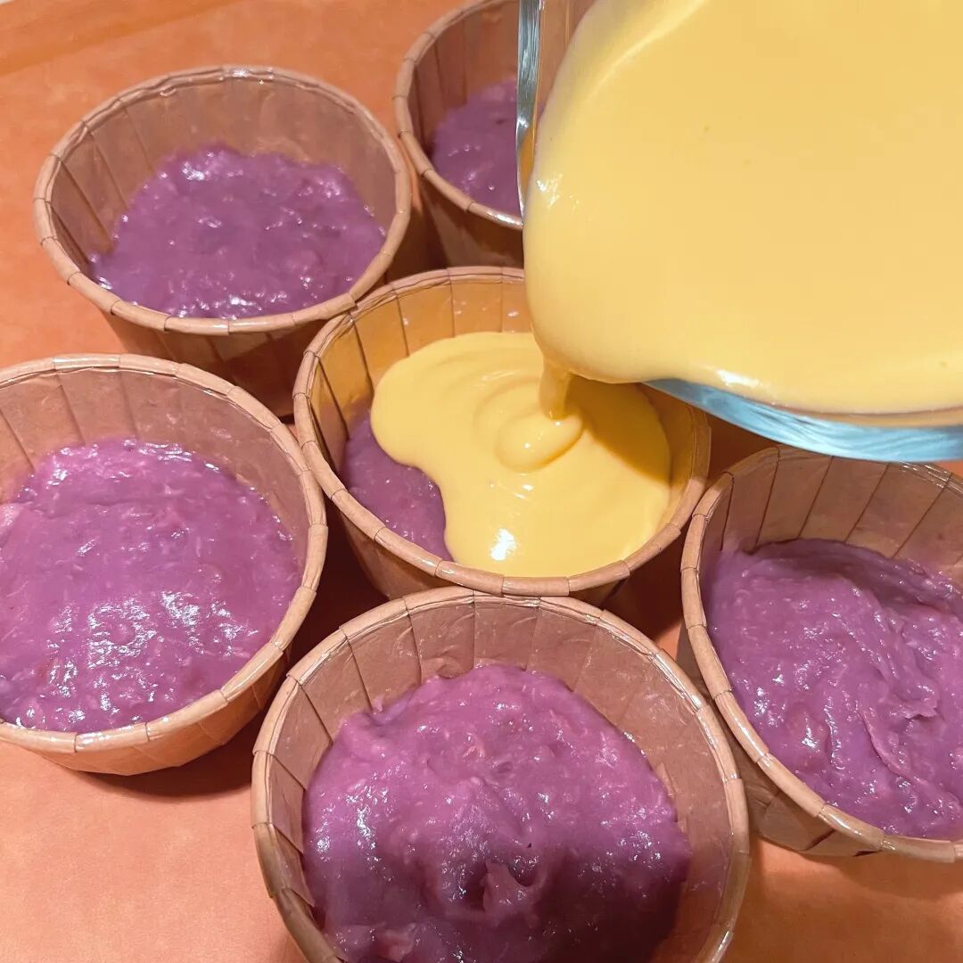 6、蛋糕纸杯倒一层芋泥再倒入奶酪糊至8分满。