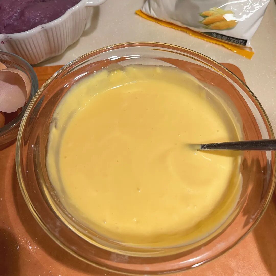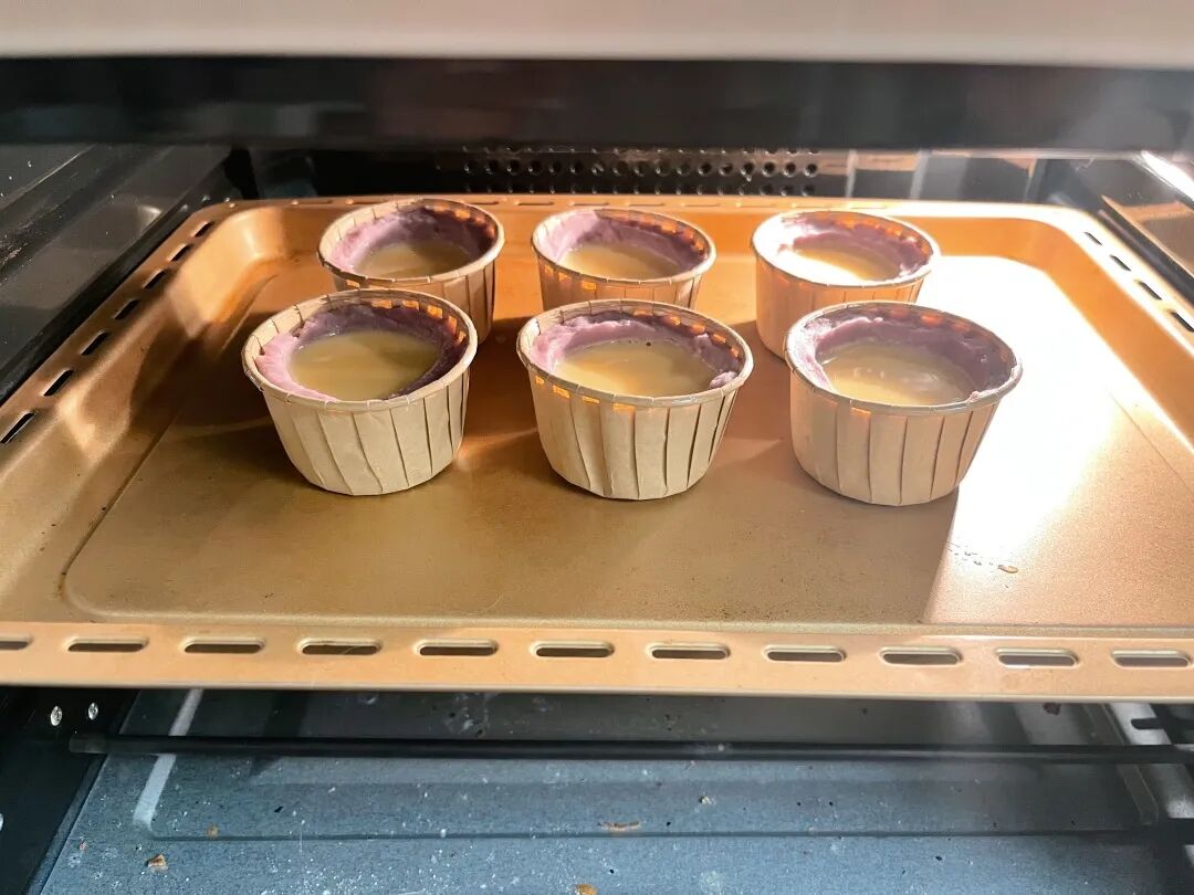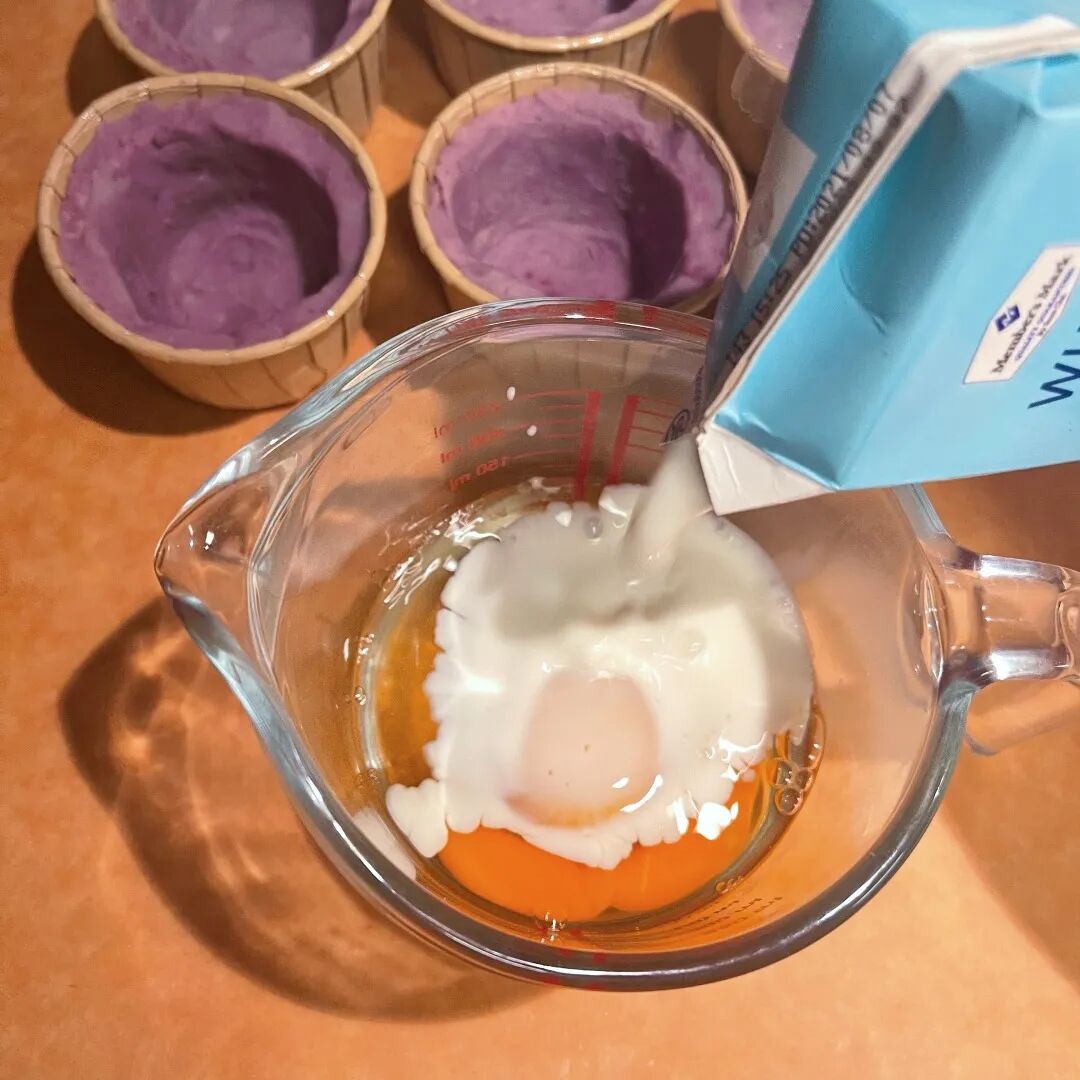 6、蛋糕纸杯倒一层芋泥再倒入奶酪糊至8分满。