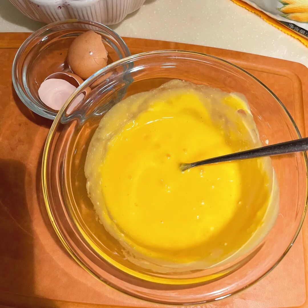 3、2个鸡蛋打散加150g牛奶、20g代糖搅拌均匀,过筛一遍。