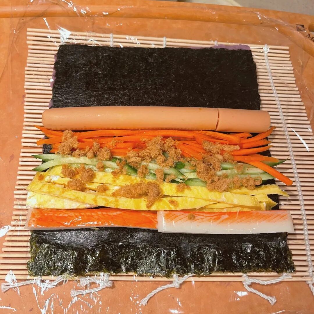 馅料部分:黄瓜、胡萝卜、蟹柳、肉松、玉米肠、无糖肉松、低卡沙拉酱、寿司紫菜