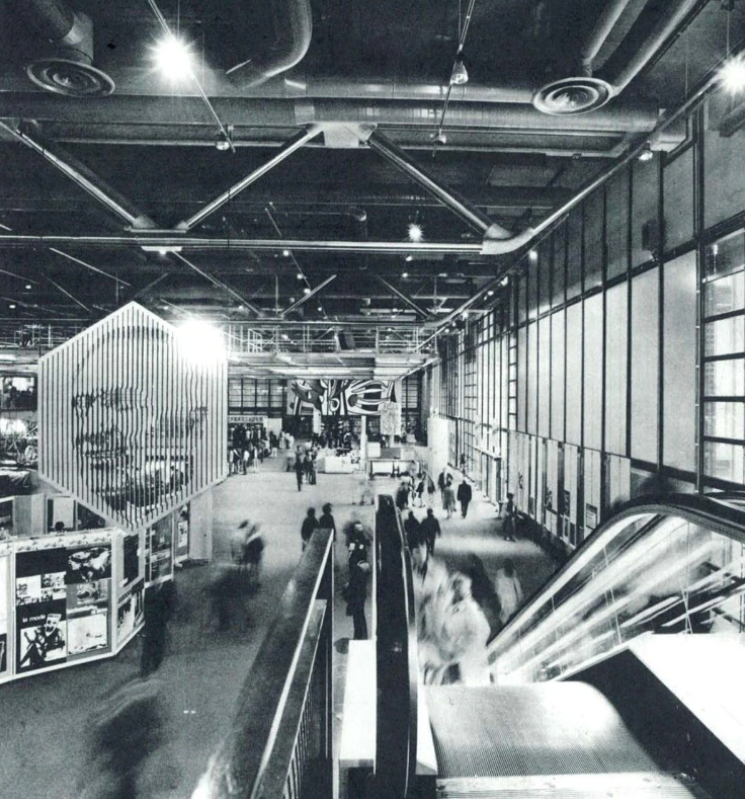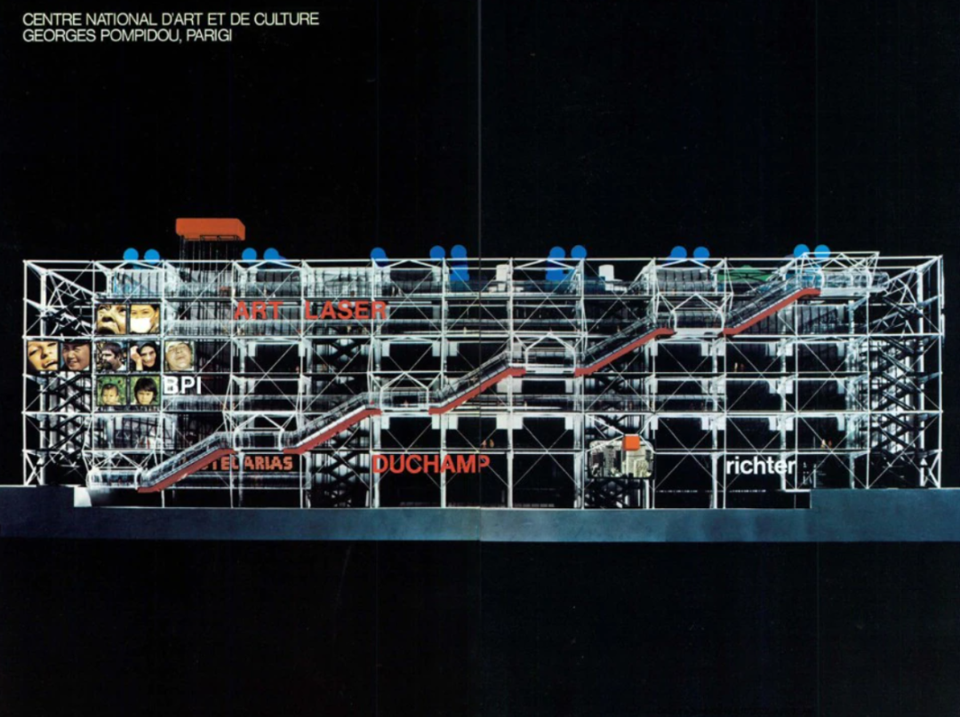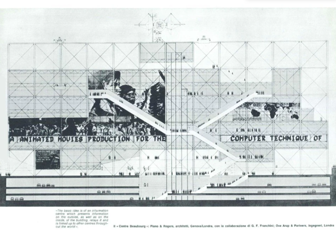 即将到来的蓬皮杜中心是一个对象,一个流行对象,一个时代的对象,更准确地说是一种交流工具,它像是一场优先考虑纯粹的交流而不是结构和技术创新的展览,“......一个承载、带来内部和外部信息的结构”。