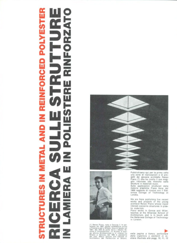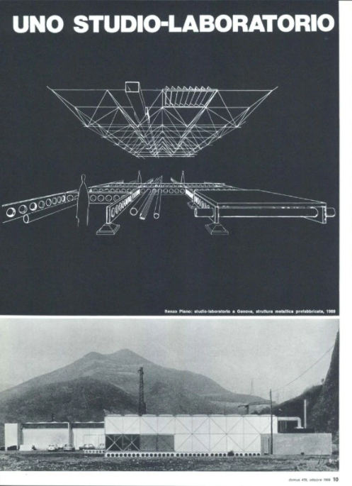 1967年,皮亚诺与他的家族公司开发了轻型结构的原型,这些模块化系统结合了简单创新的技术,智能地利用几何图案作设备,是皮亚诺作为发明家的首次亮相;两年后在为他的热那亚工作室展示项目时,又把一台工业机器移植到景观中,他强调了这个项目如何与“......要求实验者首先测试他们自己的研究结果的古老传统”相关联。