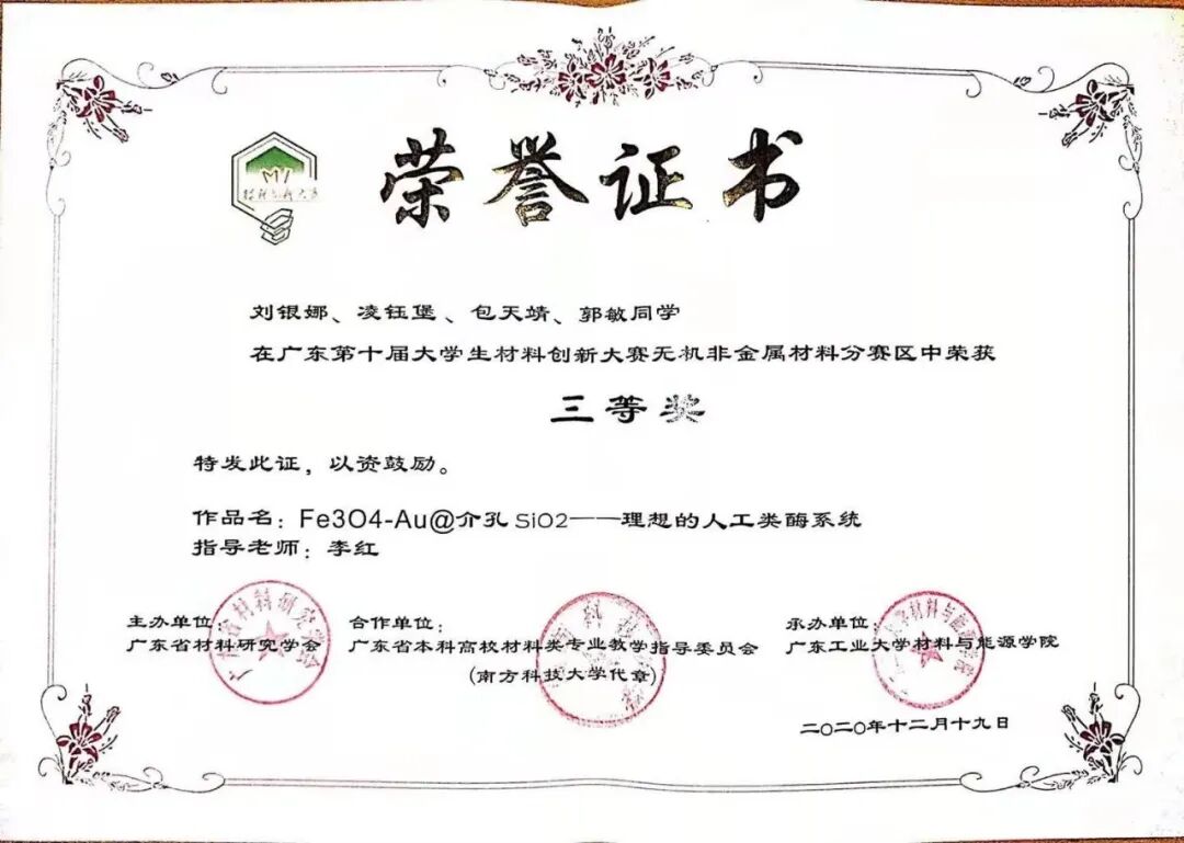 获广东省第十届大学生材料创新大赛三等奖