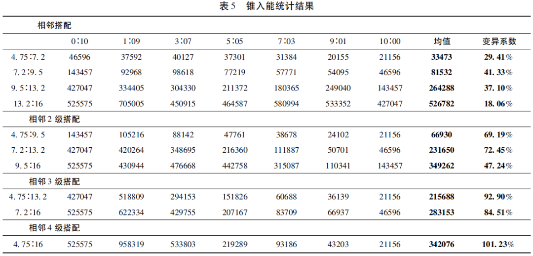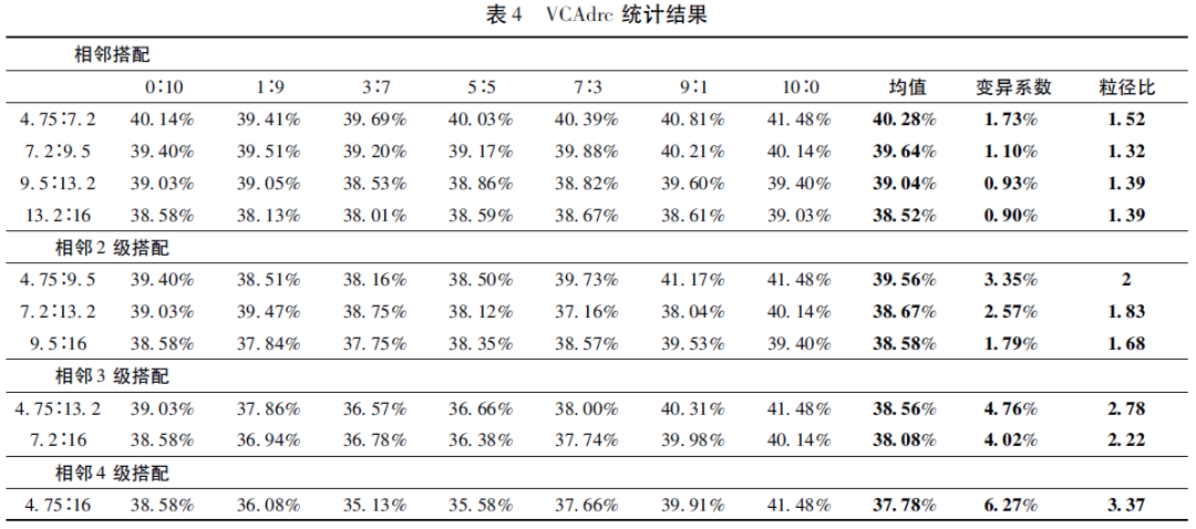 进一步按照相互搭配两档粒径的情况进行分类,分别将所有的搭配形式分成了相邻,相邻两级,相邻三级和相邻4级,结果发现无论怎样搭配在一起的两种集料,是相邻搭配还是隔级搭配,两档集料按不同比例配合以后,其抵抗锥入的能量变异性均远远大于其VCAdrc的变异性,见表4和表5,也就是说,集料配比的变化对其抵抗变形能力的影响远大于其对体积指标的影响。因此,对配比的研究和应用要慎重。