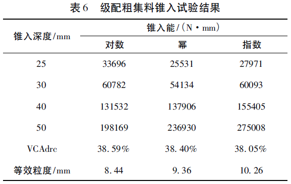 按照对数、幂和指数函数构建级配三种,按照同样的捣实成型方法进行成型,测定以后的VCAdrc值和锥入能结果如表6所示。