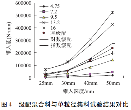 比较级配粗集料与单、双粒径锥入能试验结果,结果表明锥入能与等效粒度规律一致。与单粒径试验结果比较可见,其大小介于9.5mm集料和13.2mm集料试验结果之间,结果见图4。