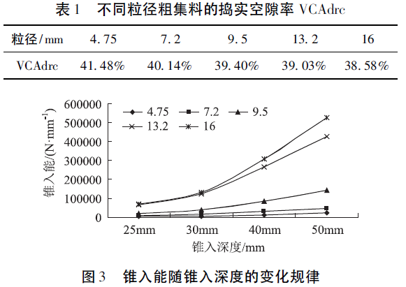 将粗集料筛分为单一粒径,进行击实成型后进行锥入试验,结果表明:随着粒径的增加,捣实状态下的矿料间隙率逐渐减小,结果如表1所示。而锥入能则刚好相反,随着粒径的增加,逐渐增加。从图3上看,锥入能随着粒径的增加在不同阶段出现剧烈增加,按照不同粒径分成了几个族群,以往有的学科将这种现象称之为“量子化”特征,也就是描述物质的能量的不连续性。对于单粒径的锥入试验结果可见,对于锥入能最大的影响因素就是集料的粒径。