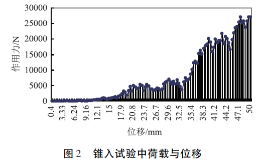 为此,设计了一种简易的评价矿料间嵌挤能力的是试验方法——锥入法。它是将一个标准尺寸的圆锥体,按照一定的位移速度插入到矿料内部,同时测量锥体在矿料内部的移动位移以及产生的相应荷载,并绘制试验曲线,试验加载和数据采集示意图1如下。
