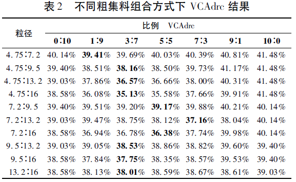 表中加粗字体部分为该两档粒径不同配比方式下矿料间隙率的最小值,从表3中可以看出,任何两档集料搭配时都存在随较大粒径集料含量减小而先减小后增加的现象,即如果以较大集料作为母体,则随较小集料的加入首先起填充作用,而后出现干涉撑开上一级骨架。