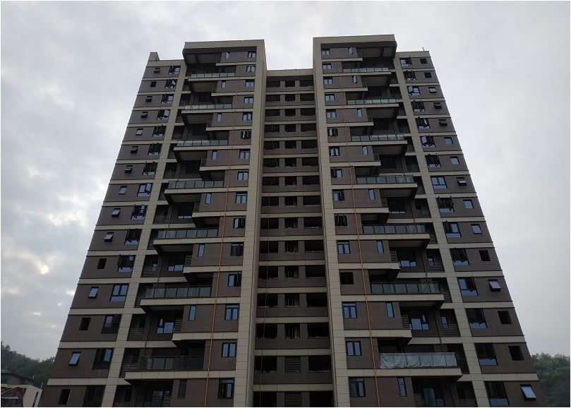 G2#楼大平层建设情况,其下面有四层楼的商业裙楼,因此住宅一楼的实际高度在20米左右,基本户户可观中央公园;总共39层高,为了结构稳固,采用了少见的全现浇外墙结构,外立面采用石材外观;