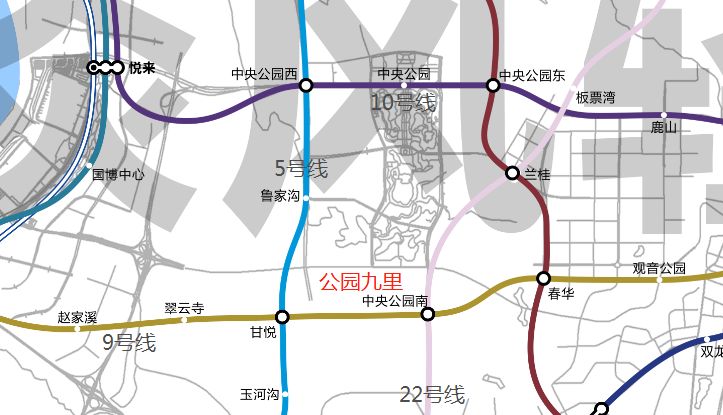 目前来看离华润公园九里最近的地铁站是在建的5号线鲁家沟站,相隔约1.5公里;远期规划13号线和22号线在附近交汇有个更近的中央公园南站,但不确定性比较大;