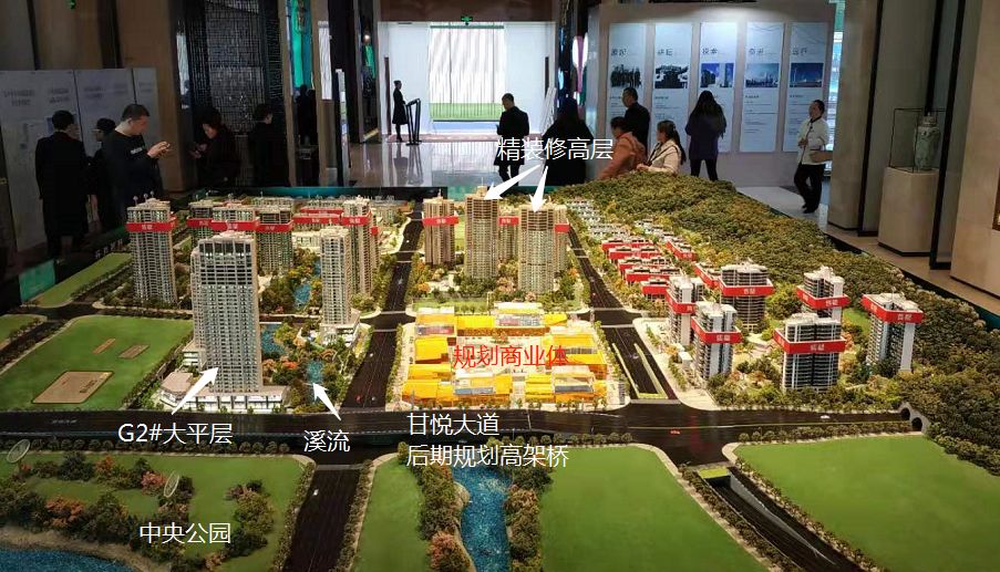 G2#大平层与中央公园仅隔一条甘悦大道,连通机场路和悦来,后期规划建设高架桥;沙盘中间黄色的区域为14万方的商业体,应该是南区唯一的大型商业配套;