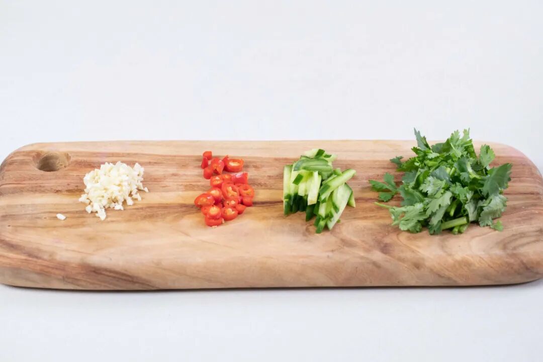 11、3瓣大蒜剥壳剁碎,3根辣椒洗净切圈,1/4根青瓜洗净切成细条,2根香菜洗净切段备用。