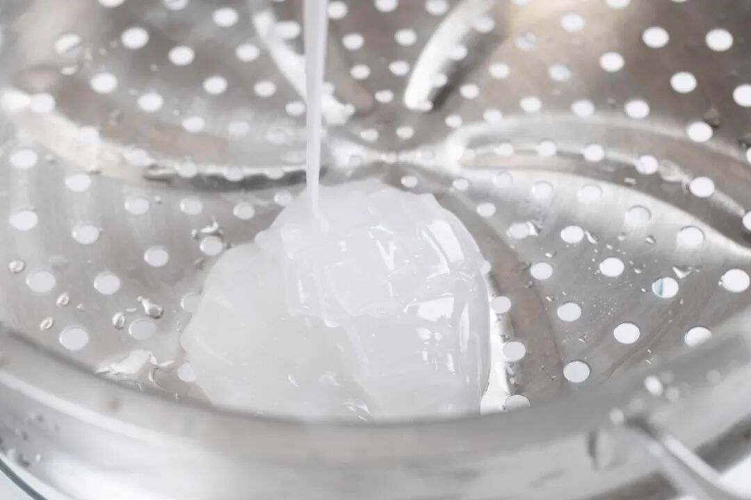 7、趁热将糊浆倒在蒸屉上,下面放装有冰水的盆。