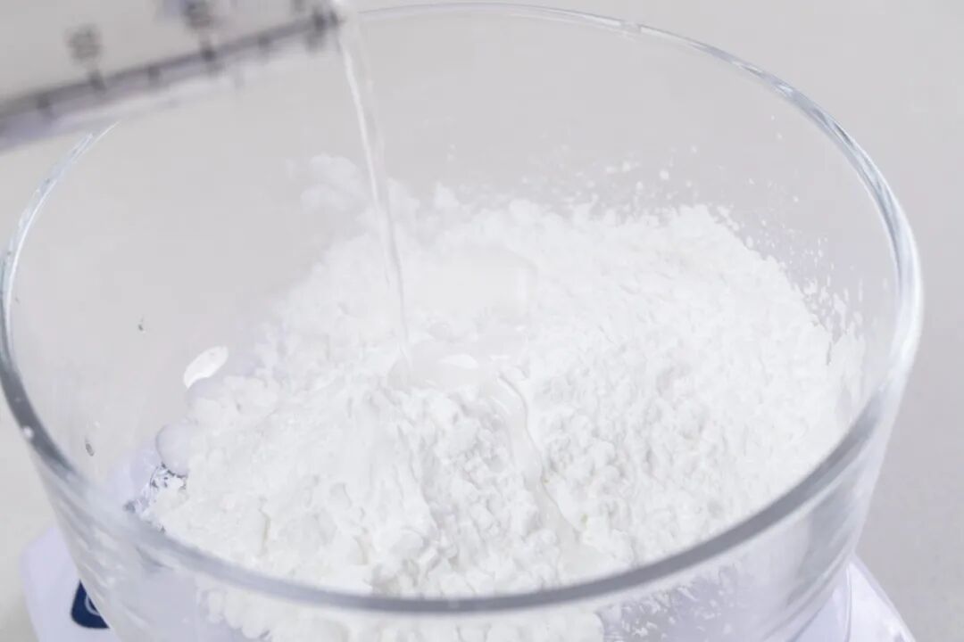 1、50g清水a加入50g豌豆淀粉中。