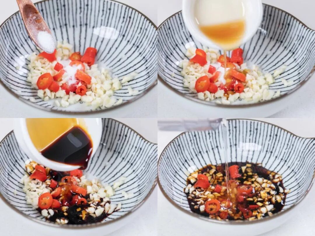 12、碗中加入切好的蒜碎和辣椒圈,继续加入5g细砂糖、10g芝麻油、15g生抽、10g白醋拌匀。
