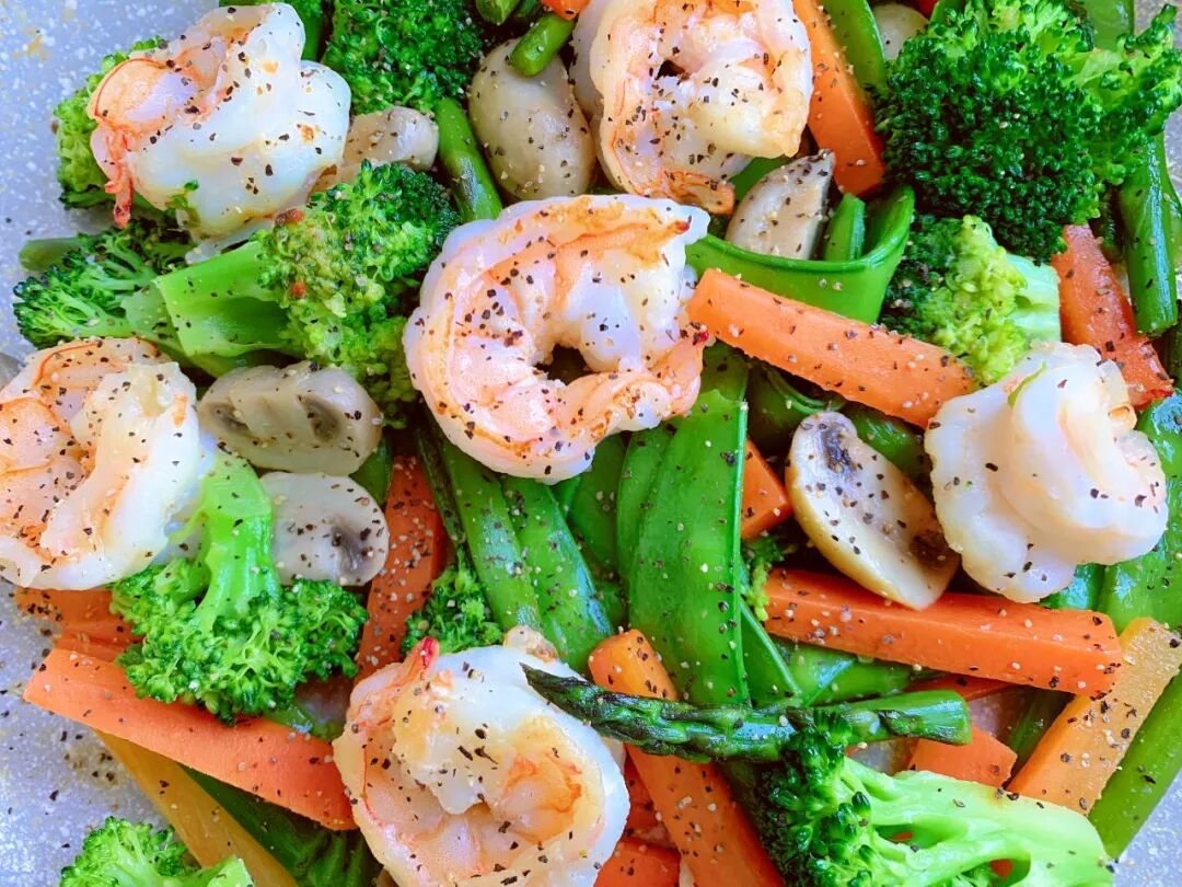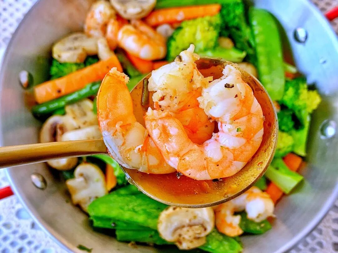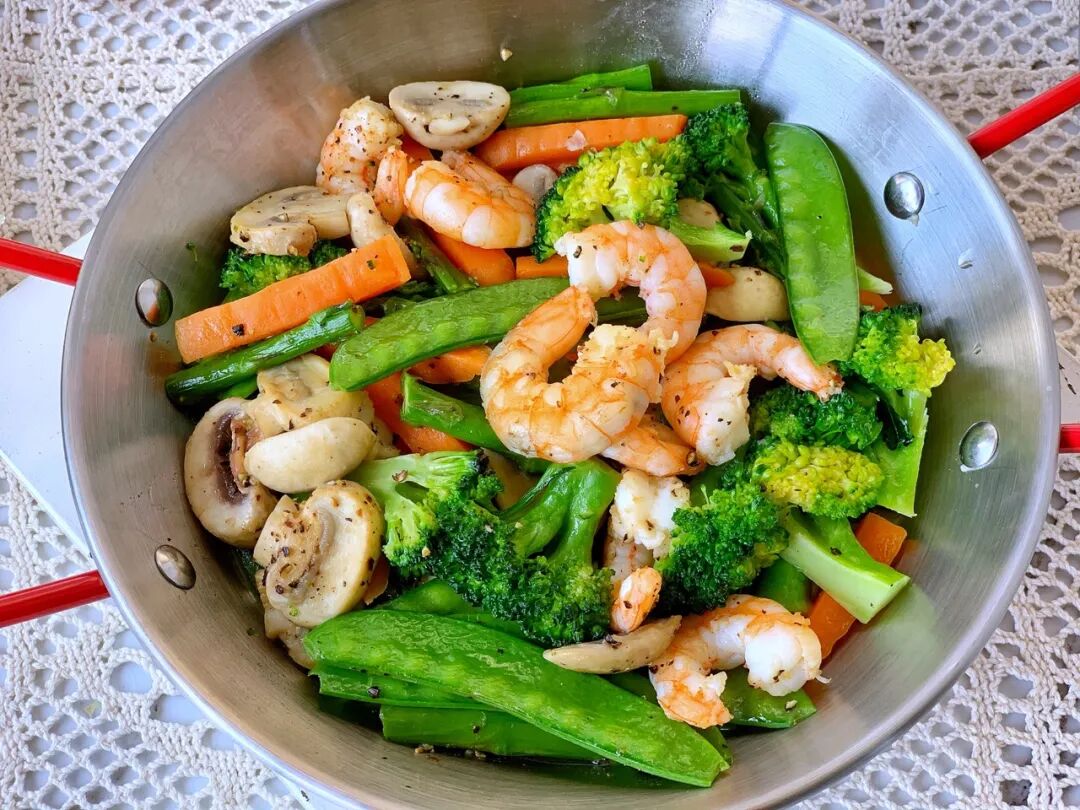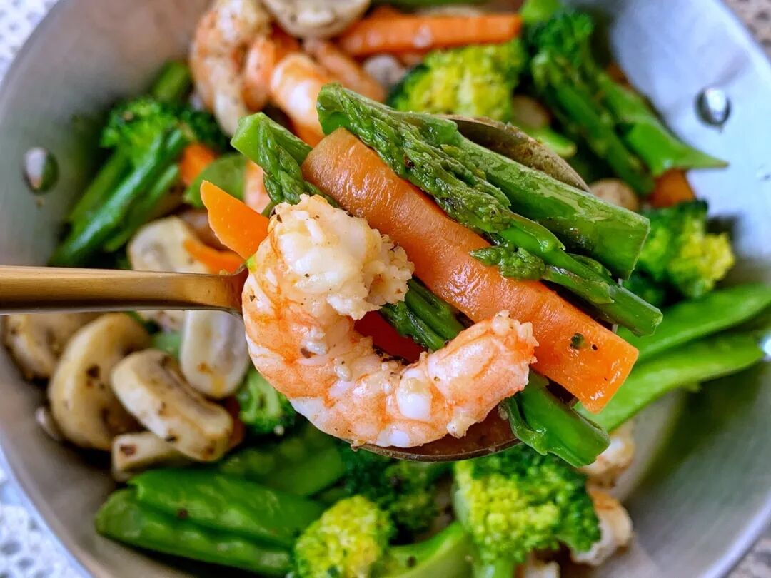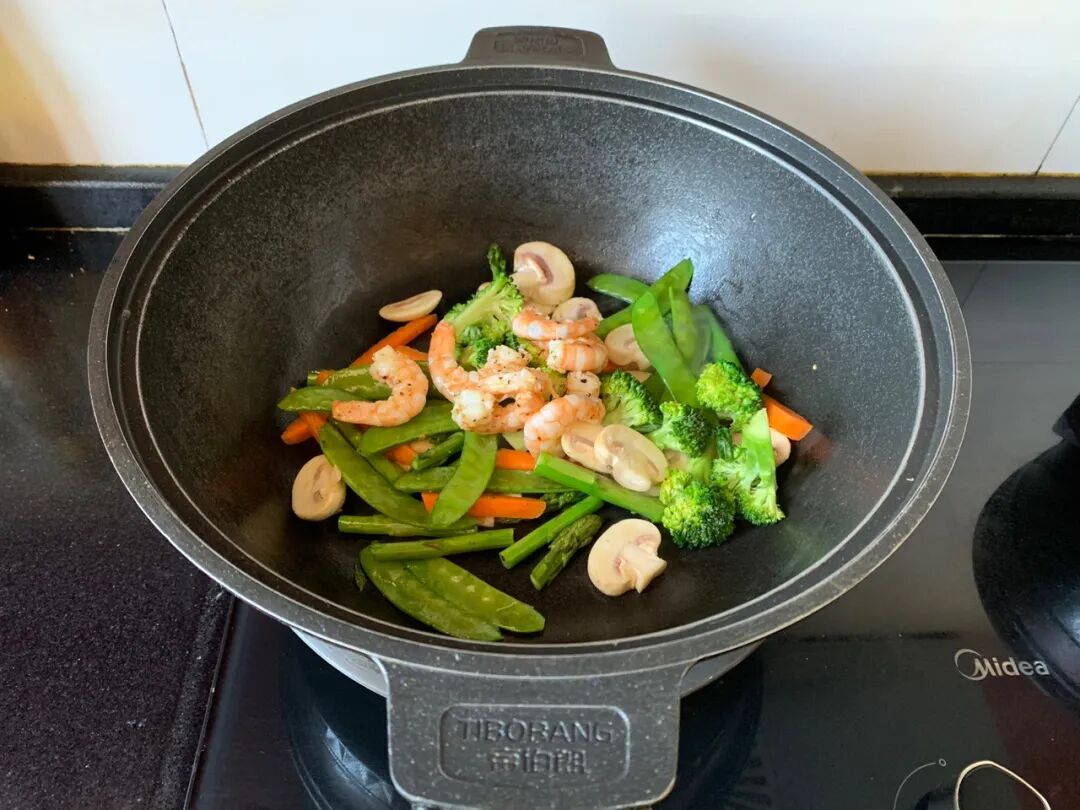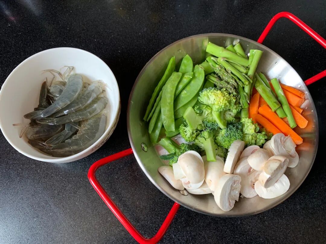 虾仁1小碗 西蓝花1小碗 荷兰豆适量 胡萝卜半根 口蘑10个 芦笋 5 根 料酒、海盐、胡椒碎适量