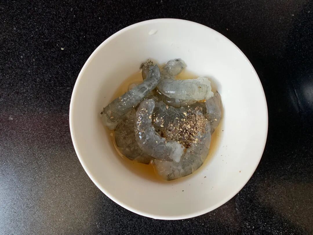 2.虾仁加入一勺料酒,适量黑胡椒碎拌匀腌制十分钟。