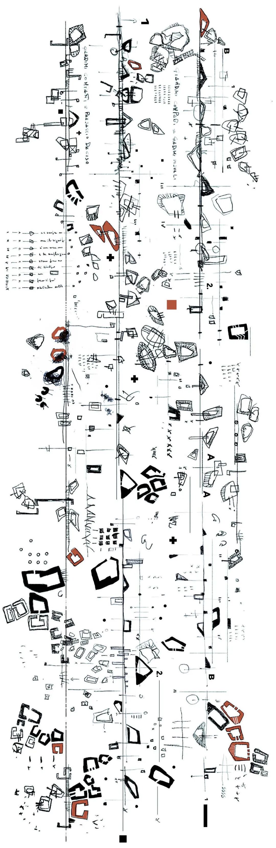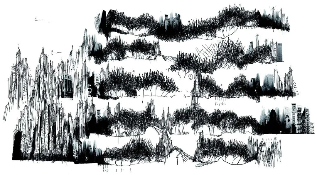 我们应该注意到,这种绘画方式有助于设计师在设计早期仅仅依靠回忆过往空间经验捕捉和布局景观的各种可能性。因此可以推断,莫拉比托的作画是一个编辑记忆的过程,是厄庇墨透斯(后见)与普罗米修斯(先见)的融合——一方面择取记忆,另一方面思考它在另一个时空的变形——这是一个赋予想象(他理想的城市景观)以远见和意义的过程。