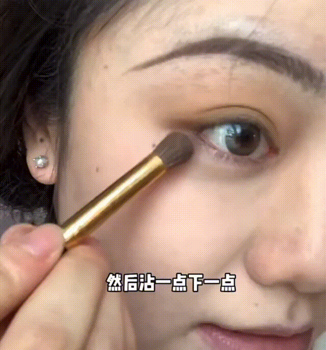 用上眼皮打底色眼影余粉,轻轻铺染下外眼角,一秒钟狠狠拿捏深邃感。