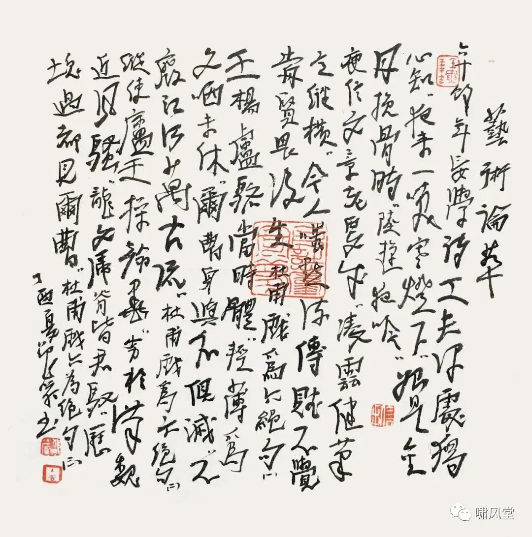了解了书法中的“器”与“道”,还应该深悟艺术与个性的关系,艺术个性跟个人气质、性格、悟性有关,这些不是每个学书法的人都可以培养或通过努力可以达到的。你要有反叛精神,将今人和传统的书法当作一个参照系之后,再叛离。而不仅是继承关系,继承也是为了叛离,是在高起点上的叛离,独执偏见一意孤行。走偏僻的路,抗拒所有大师的诱惑,并提出疑问,因为你想要表达的一定是发自内心的呐喊,是理性思考后的高度感性的“人的本质力量的对象化”的精神呈现。创新总是在众人的质疑和提问中走过来的,这是铁的规律,从历史来看,徐渭之于明代,八大之于清代,齐白石之于民国,凡高、高更之于十九世纪欧洲等,皆是如此,所以众人自有提问质疑的权利,艺术家则必须坚持。故创新有着顽强的排他性,它不是安抚,而是引爆,从而唤起对生命力的感悟和觉醒,写进历史。如同法国熊秉明先生所言:“书法是中国文化核心的核心。”然而“水不流则腐”,万物进化则生生不息,当我们面对传统经典时,“我在哪里”便成了寻找自我价值的第一“追问”,传统是变化的,晋尚韵,唐尚法,宋尚意,明、清尚态……我们这个时代“尚”什么?长久的未来会“尚”什么?