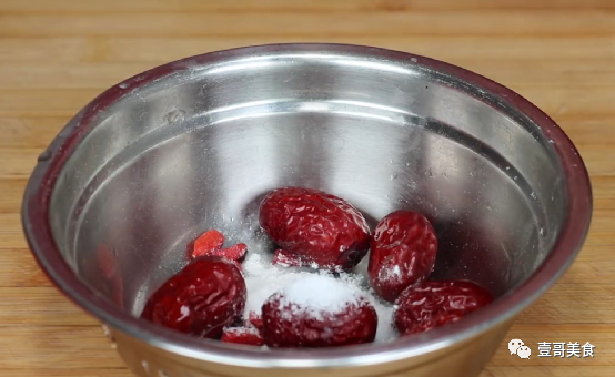第三步:接下来再准备适量的红枣和枸杞,然后就把红枣和枸杞一起放在小碗中,跟着就往小碗中加入适量的清水和一勺食盐、一勺面粉,把红枣和枸杞清洗干净。食盐能够杀菌消毒,面粉能够吸附脏东西,这样洗的更干净。