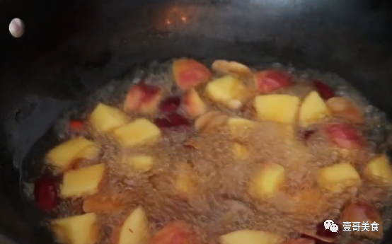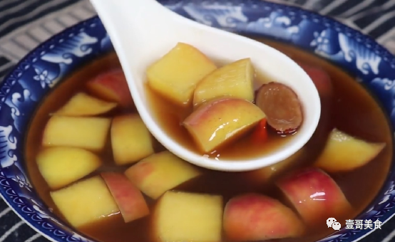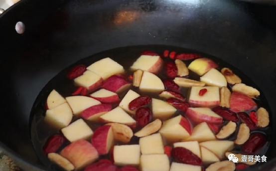 第七步:第二个好处就是助消化,煮熟的苹果的维生素能够更快地被人体吸收,辅助消化;第三个好处就是美容养颜,苹果熟透以后有抗氧化的作用,加入红枣和枸杞,更具有补气养血的作用,从而能够保护肌肤。