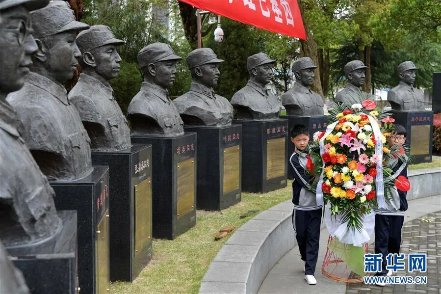 ▲ 在江西省南昌市新四军军部旧址纪念广场,南昌市书院小学学生向革命先辈的塑像敬献花篮(2019年4月4日摄)。新华社记者 彭昭之 摄