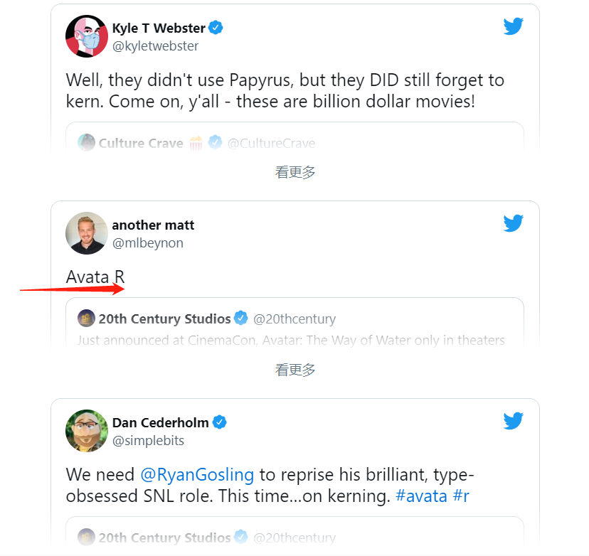 设计师指出,字距调整似乎有点不对劲,最后两个字母之间的距离,让人觉得这部电影的标题是“ AVATA R ”。它几乎不像新的忍者标志那样难以辨认,但一旦你看到它,就很难看清。