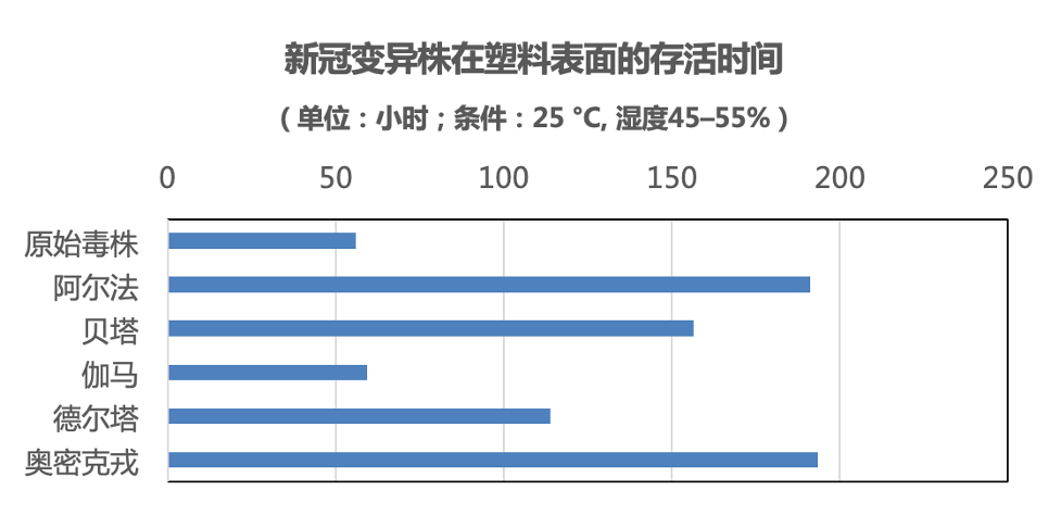 日本研究者发现,在塑料表面,原始毒株只能存活56小时,而奥密克戎可以存活8天。[1]