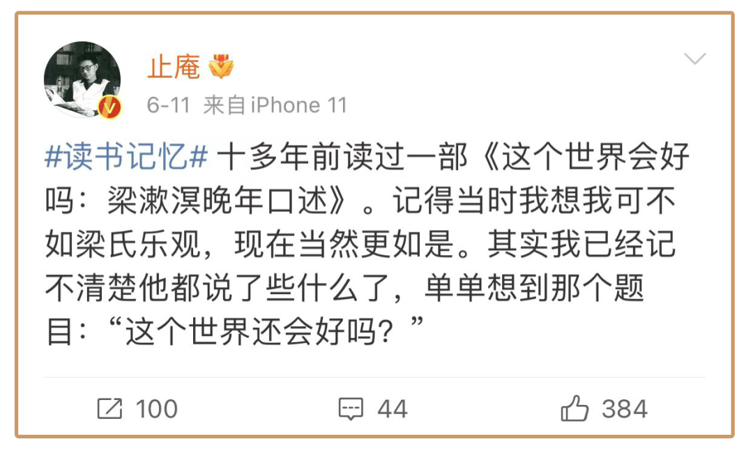前阵子,我看作家止庵的微博也提到这句话: