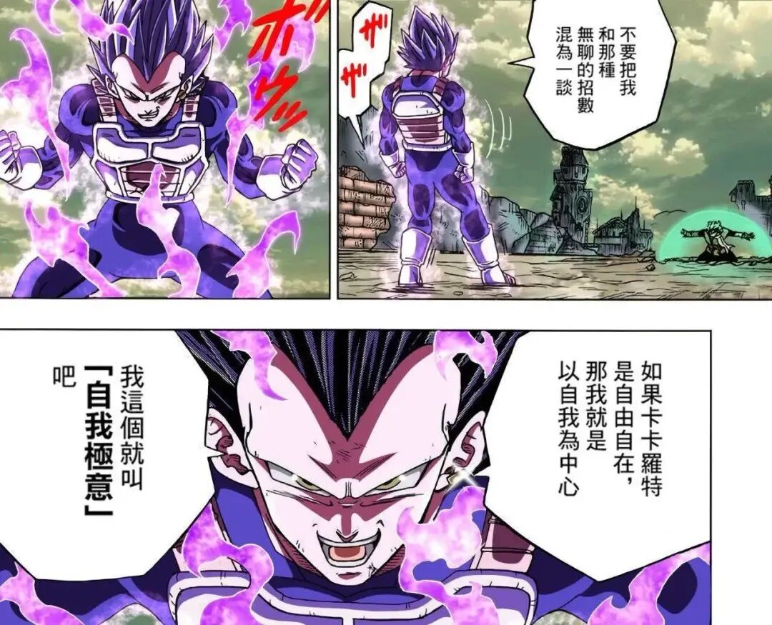出自《龙珠超》中贝吉塔的技能, 和悟空的自在极意功完全相反,自我的原理是正面硬刚敌人的攻击,利用疼痛来燃烧他的斗志,突破身体极限,爆发出更强的力量。但是这个技能有着比自在极义宫更强的副作用。贝吉塔的肉体可以承受的伤害是有限的,并且在战斗中过于激进,往往因为用力过猛而变成速趴贝吉塔。
