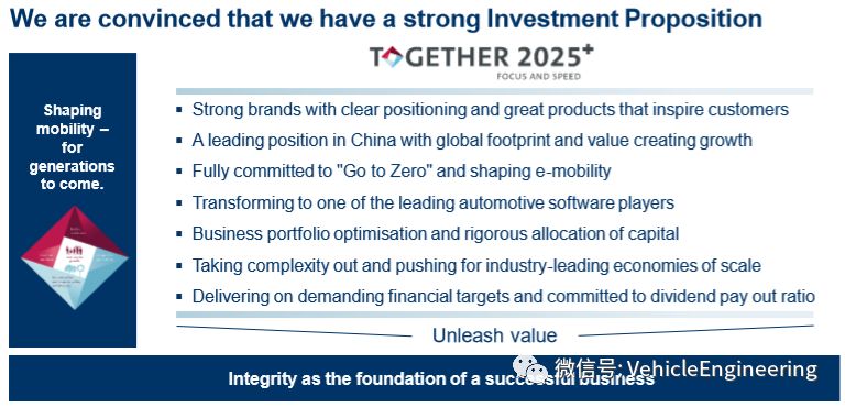 但其实应征中国一句古话“大道至简”例如可以关注我们之前文章整车架构平台核心-大道至简(Complexity Reduction)五步骤就是整车架构平台的核心,但鲜有人知道这句出自于《道德经》的整句是“万物之始,大道至简,衍化至繁”所以架构平台核心是去复杂度,归纳明晰所有客户要求点Attributes,Features&user experience,罗列划分好汽车零部件所有的commodities,然后计划Portfolio《从上海车展初探产品矩阵组合Product Portfolio》组合所有的vehicle lines 以及derivants 或者derivatives让平台能够衍化出千变万化的产品从而满足不同市场和不同要求的客户,最终实现万物之始-盈利profitability。所以让我们来简单解读下大众CFO演讲的PPT.