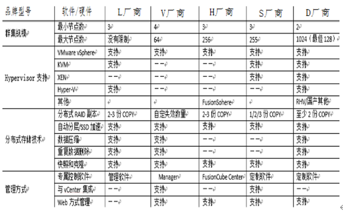超融合架构(简称HCI)是实现软件定义数据中心的技术途径。HCI在目前国内市场销量很大,除了传统的硬件厂商,还有一些新兴的厂商,甚至还有一些安全厂商也在做HCI产品。这些厂商每个产品有自己不同于其他厂商的特点,可以适应多种不同的应用场景和环境。HCI市场能够实现快速的增长,一是随着软件定义技术逐渐走向成熟,带动X86开放架构市场的兴起,HCI成为了IT基础设施进化的必然结果。二是对传统架构的创新,在IT资源的分配和管理上相比传统架构更加灵活,特别是超融合系统的分布式存储架构。下面是几款超融合产品的对比图: