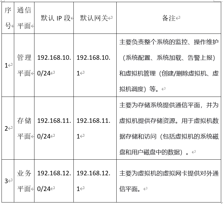 在进行方案的IP地址规划之前说明几个易混淆的概念,一是该产品的虚拟化解决方案通过在服务器上部署虚拟化软件,使一台物理服务器可以承担多台服务器的工作。通过整合现有的工作负载并利用剩余的服务器以部署新的应用程序和解决方案,实现较高的整合率。二是该产品的云操作系统软件,主要负责硬件资源的虚拟化,以及对虚拟资源、业务资源、用户资源的集中管理。该产品的云操作系统包含管理平面、存储平面、业务平面这三个通信平面: