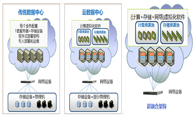 1. 实现了计算、存储和网络资源的统一融合:传统架构下的计算资源和存储资源是分离的,服务器通过SAN交换机与存储设备连接获取存储空间。超融合技术改变了传统服务器、存储、网络相互孤立的基础架构,实现计算资源、存储资源和网络资源的统一融合,每一台超融合节点单元可同时提供计算资源和存储空间。超融合架构采用软件定义的体系结构,不再依赖于硬件,计算、存储、网络完全虚拟化并由软件控制。服务器和存储得到了统一的部署和管理,并为整个虚拟化体系提供了简单、通用的管理和自动化平台。