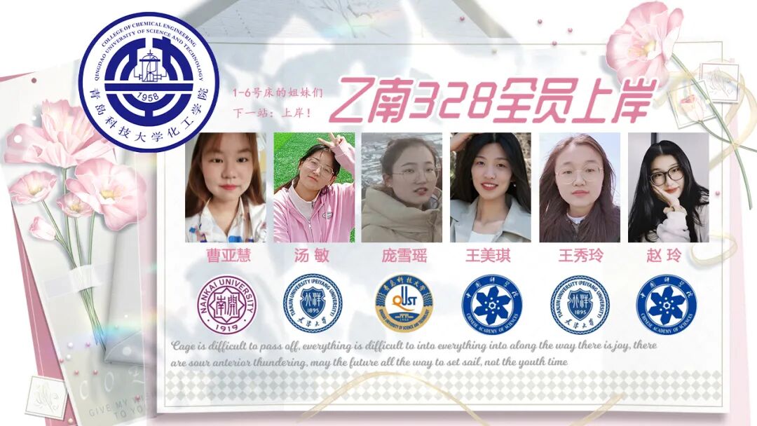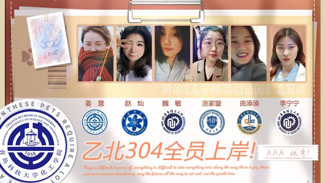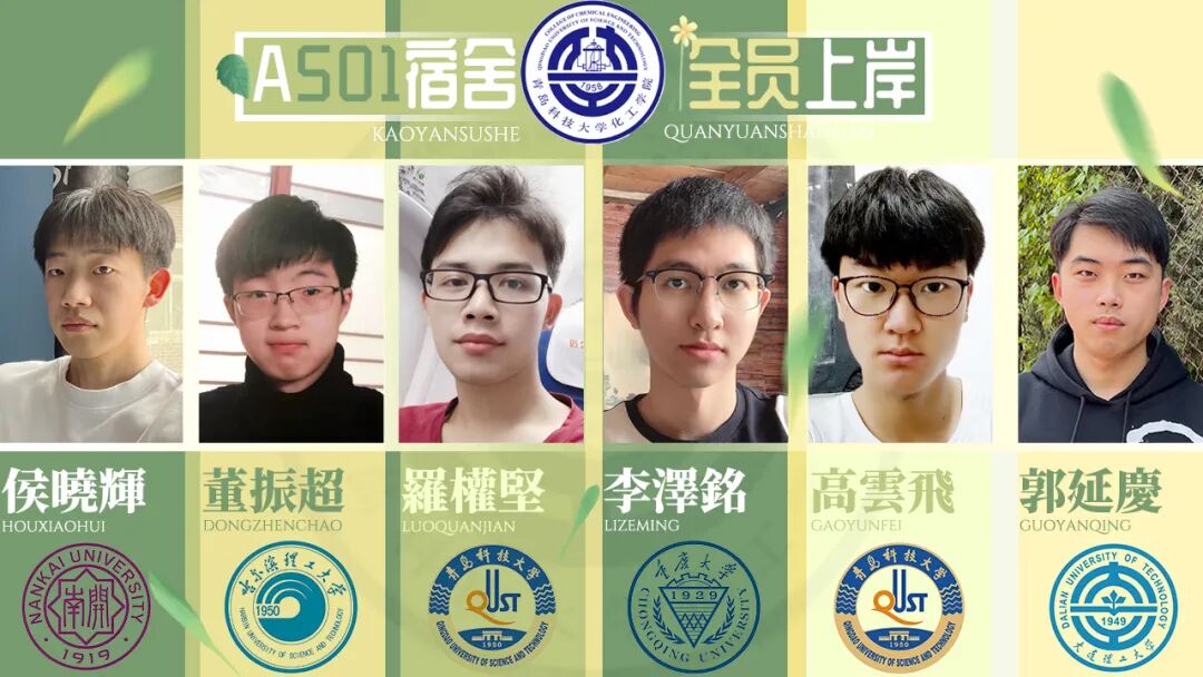 近日,青岛科技大学化工学院慧园乙北304宿舍的六位女生实现了考研全员上岸。其中,3名同学推免读研,1名同学被大连理工大学录取1名同学被华东理工大学录取,1名考取本校继续学习。