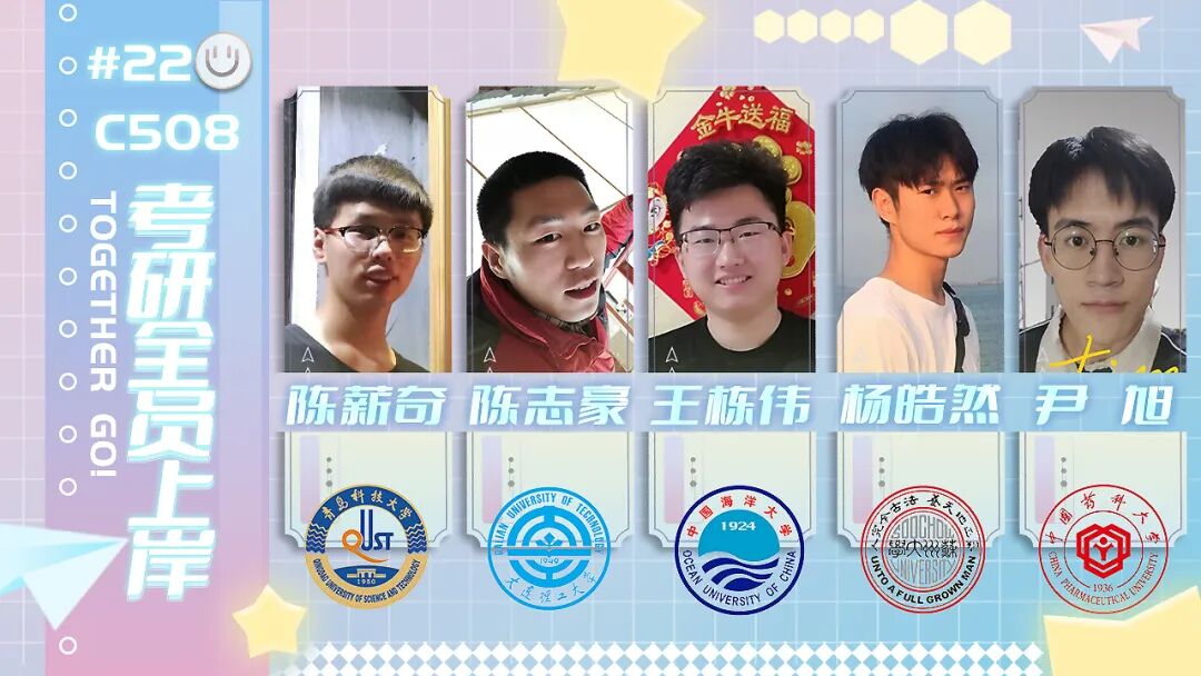 漫漫考研路,化工学院22号楼C508宿舍的五位男生选择携手前行、彼此陪伴、相互鼓励。同一屋檐下,宿舍里的每一个人通过努力学习均成功考研上岸,共同打造了属于他们的“学霸宿舍”。他们是来自化工学院制药工程与制剂工程的“五位帅哥”:王栋伟,尹旭,陈薪奇,陈志豪,杨皓然,分别被中国海洋大学、中国药科大学、青岛科技大学、大连理工大学、苏州大学录取。