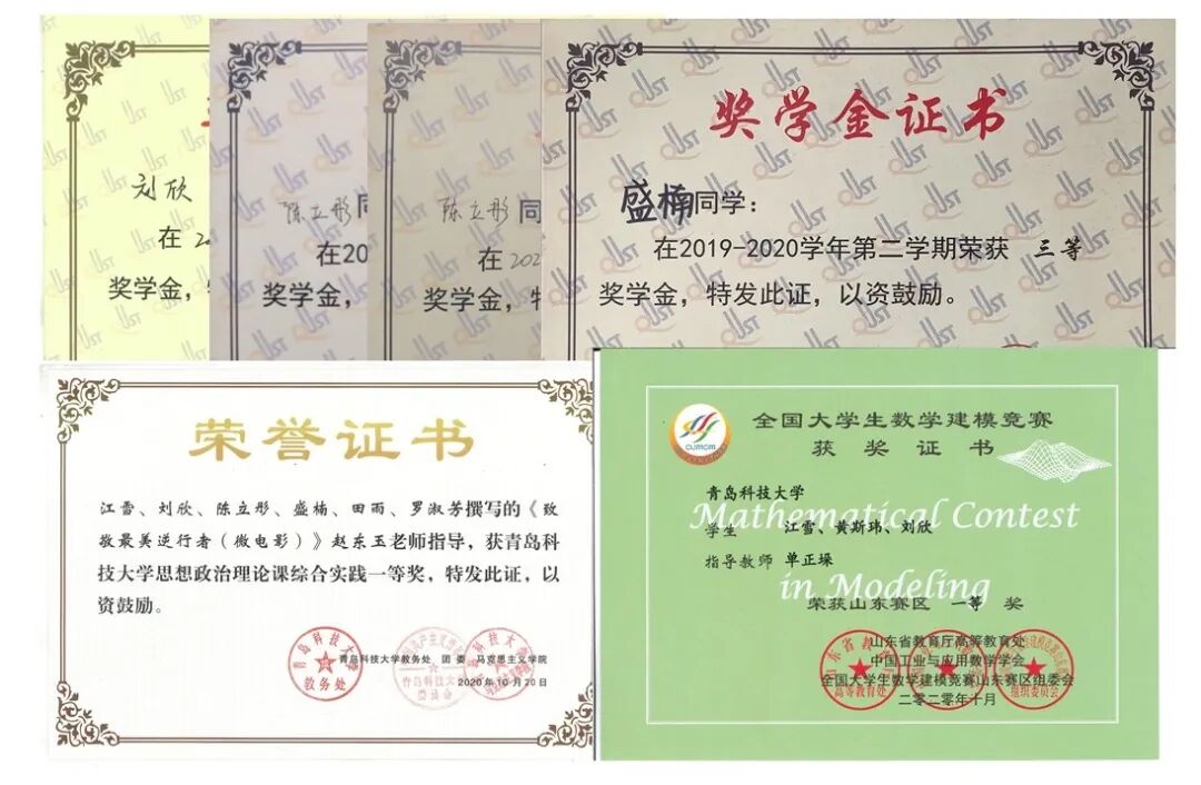除了学习方面取得的硕果,他们宿舍全体成员在素质拓展方面也从未落后,曾获大学生数学建模竞赛二等奖2次、青年中国行全国百强战队1次、全国大学生制药工程设计大赛三等奖1次、全国大学生生命科学创新创业大赛三等奖4次、全国大学生创业计划大赛二等奖8次三等奖3次、山东省大学生创客大赛二等奖1次三等奖2次、大学生创新创业大赛校级优秀奖1次、青岛科技大学首届TRIZ杯大学生创新方法大赛一等奖1次、中国化学学会年会优秀志愿者1次、山东省大学生化工过程实验技能竞赛优秀志愿者1次、青马大赛优秀志愿者1次、创客之星”1次、十佳创客团队1次、计算机二级证书1次、已发表论文1篇。这些素质拓展活动不仅促进了他们个人的成长,荣誉和成绩也增强了宿舍集体的自豪感和凝聚力。